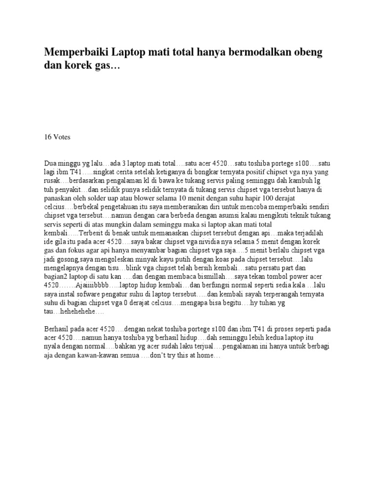 Cara memperbaiki laptop acer yang mati total. Tanda power supply komputer rusak penyebab laptop mati sendiri. Faktor penyebab laptop mati total akhir akhir ini mungkin anda kesal karena laptop anda mati secara tiba tiba tanpa diketahui penyebabnya. Sehingga kalau dia bermasalah sedikit saja bisa berefek pada kesulitan besar pada pekerjaan kita. Ada banyak hal yang menyebabkan laptop mati total mulai dari masalah kecil hingga masalah yang memerlukan penanganan serius yang mungkin akan menguras dompet anda. Cara memperbaiki laptop yang mati total sebagai salah satu barang penunjang utama pekerjaan kita laptop bisa dianggap sebagai separuh nyawa. Tapi tenang anda tidak perlu menjadi frustasi karenanya. Cara mengatasi laptop mati total kali ini admin blog akan share kembali artikel tentang cara memperbaiki laptop fokusnya adalah cara mengatasi laptop mati total atau matotspesial buat anda yang ingin serius memperbaiki laptop setelah sebelumnya kita belajar cara memperbaiki baterai laptop drop. Jika anda bekerja di kantor mungkin ada backup dan file file pekerjaan yang terserak di beberapa tempat.